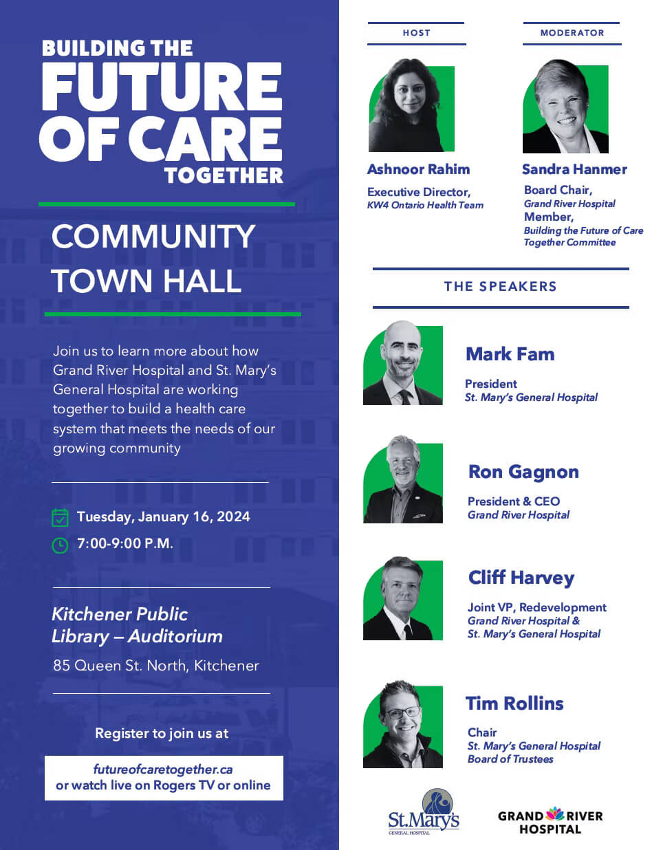 Le 17 janvier 2024, des membres de la communauté se sont réunis à la bibliothèque publique de Kitchener pour une assemblée publique, animée par Mark Fam, président de l'Hôpital général St. Mary's, et Ron Gagnon, président-directeur général de l'Hôpital Grand River. S'inscrivant dans une série régionale, cet événement visait à favoriser les discussions collaboratives et à encourager un dialogue communautaire sur l'avenir des soins de santé. Les participants ont participé à une séance de questions-réponses mettant l'accent sur l'engagement communautaire. L'événement était animé par Ashnoor Rahim, directeur général de l'équipe Santé Ontario KW4, et modéré par Sandra Hanmer, présidente du conseil d'administration de l'Hôpital Grand River.