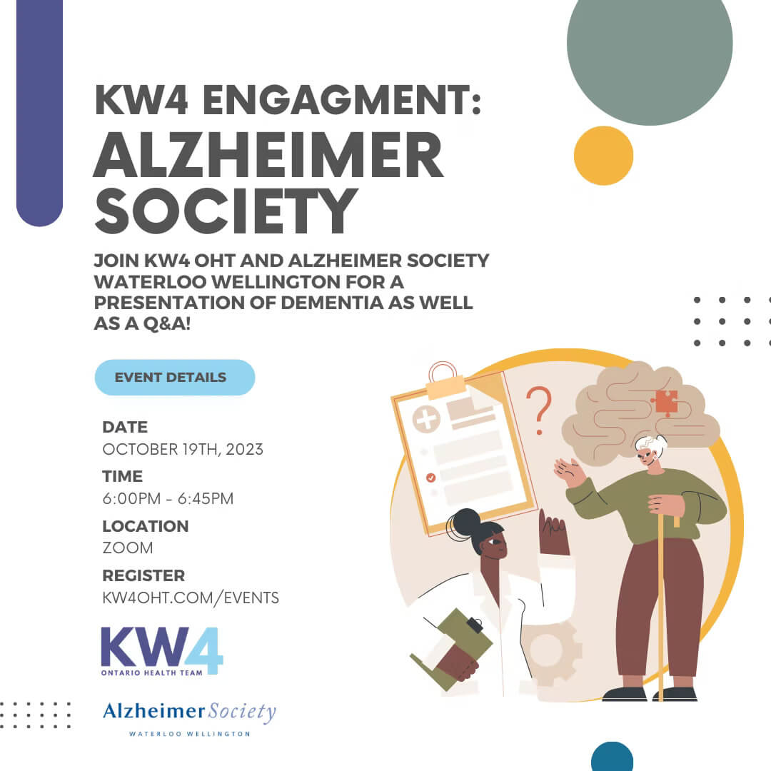 Le 19 octobre, l'équipe de santé mentale KW4 et la Société Alzheimer ont organisé un événement communautaire virtuel informatif. Les membres de la Société Alzheimer ont discuté de la maladie d'Alzheimer et des types de démence, de leurs caractéristiques et des ressources de soutien disponibles. Cet événement visait à sensibiliser et à renforcer la communauté KW4.