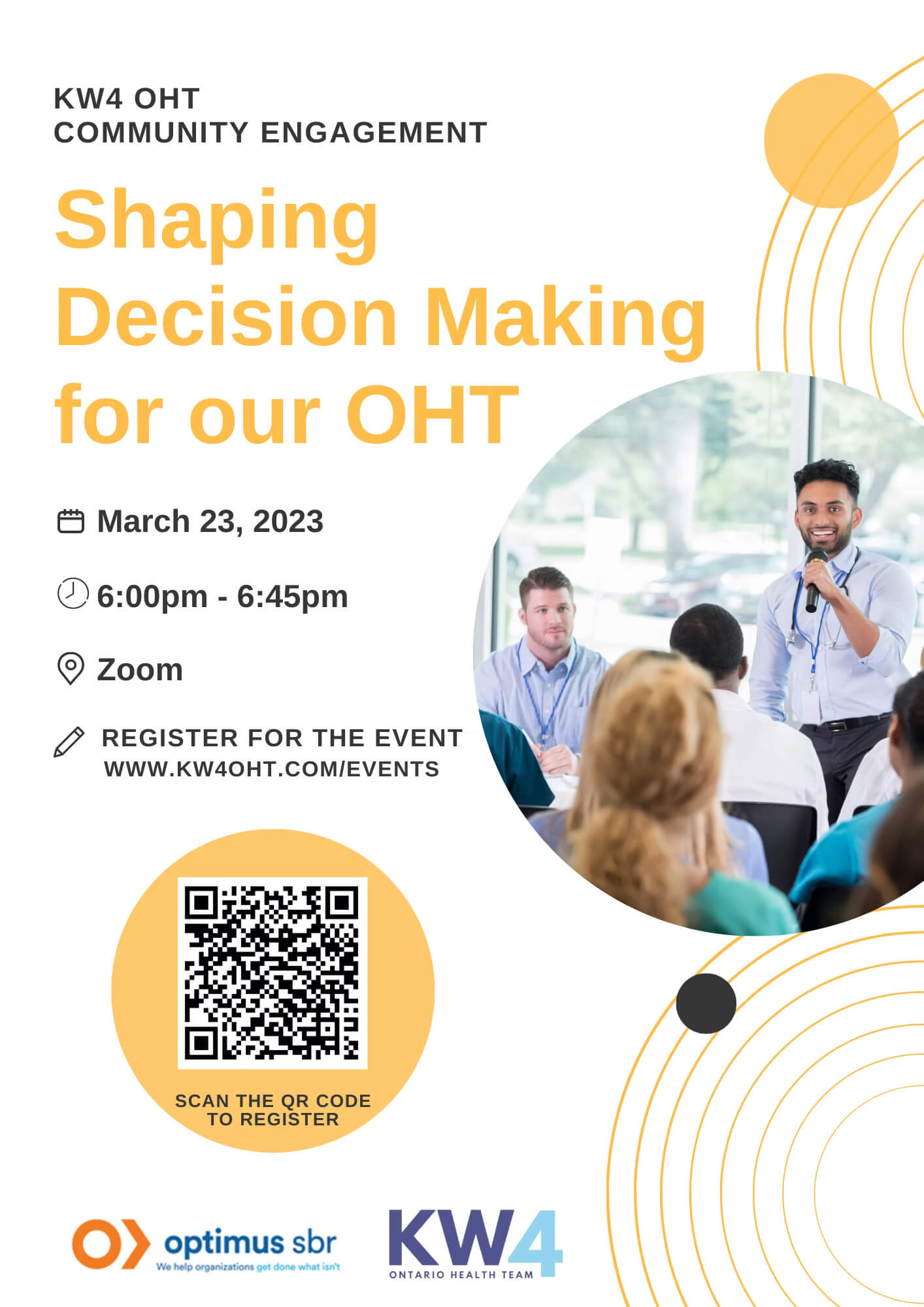 L'équipe KW4 OHT a tenu son symposium annuel sur la gouvernance des membres le 24 avril 2023. Organisé conjointement par l'équipe KW4 OHT et Optimus SBR, ce symposium a réuni plus de 40 personnes, dont des membres et partenaires de l'équipe KW4 OHT, des représentants de la communauté et des animateurs. L'événement visait à faire le point sur l'état actuel de l'équipe KW4 OHT, à identifier les changements à apporter à sa gouvernance et à assurer l'harmonisation de sa mission avec les directives du ministère de la Santé et de Santé Ontario.
