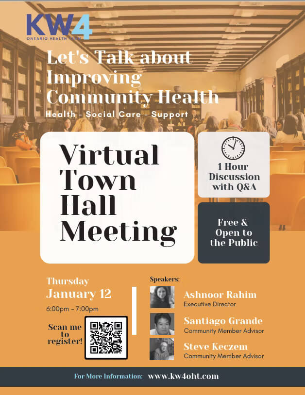 L'équipe Santé Ontario KW4 a invité les membres de la communauté à participer à une assemblée publique virtuelle le soir du 12 janvier 2023. L'événement a réuni des membres de 47 organismes de la région KW4. L'objectif principal de l'événement était de faire connaître l'équipe Santé Ontario KW4 et de faire connaître les projets 2022-2024 que l'équipe Santé Ontario KW4 entend mettre en œuvre avec la communauté.