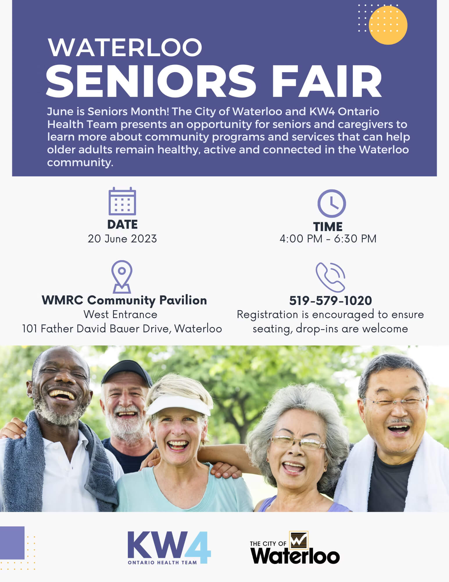 Le 20 juin, la Foire de la santé des aînés a été organisée conjointement par la Ville de Waterloo et l'équipe Santé Ontario de KW4. L'objectif de l'événement était de permettre aux aînés et à leurs aidants de se renseigner sur les différents programmes communautaires, services sociaux et organismes de santé de Waterloo qui aident les aînés à rester en bonne santé, actifs et connectés.